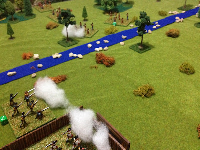 | The tabletop setup for the Battle of Fort Presque Isle, the river is fordable by all units except artillery and is treated as difficult terrain. |