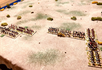 | Opening moves of the game with Roman forces defending the town and wooded hill and Carthaginian forces having to wheel around to engage. |